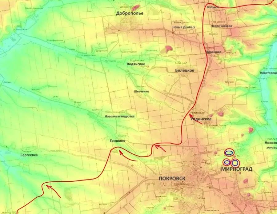 Наступление на Гришино. Опираясь на ранее освобожденное Покровское (поселок), российские войска развивают наступление на Гришино с двух сторон. Южная и юго-восточная части населенного пункта уже под контролем РФ. Сейчас идет продвижение по дороге, чтобы охватить северо-восточную часть и захлопнуть ловушку.