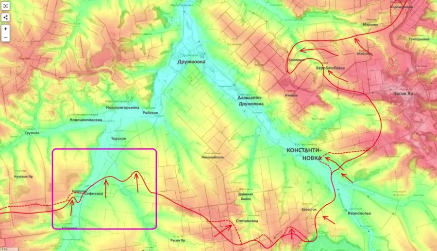 Подоляка прогнозирует повторение маневра, погубившего оборону Северска: удар через высоты и выход к Рай-Александровке, которая является важнейшим логистическим узлом. Ее взятие фактически запустит Славянско-Краматорскую наступательную операцию.
