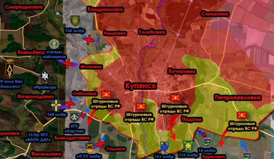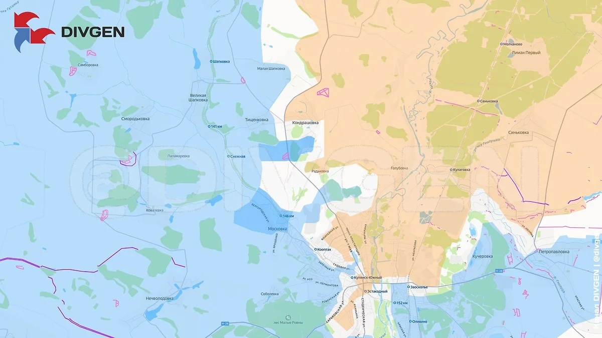 Непосредственно в черте Купянска идут ожесточенные городские бои. Ситуация динамична: противнику удалось временно закрепиться в Кондрашовке и потеснить российские позиции на юге, однако выше по фронту ВС РФ заняли новые выгодные рубежи у Двуречанского.