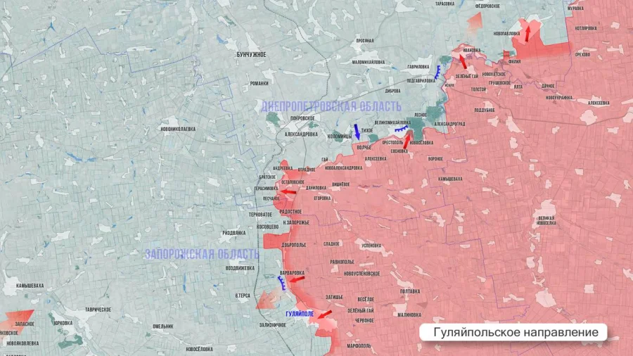 На запорожском направлении российская армия продолжает планомерное продвижение к областному центру с южного направления, вдоль Каховского водохранилища. В северной части Приморского фиксируются стрелковые бои.
