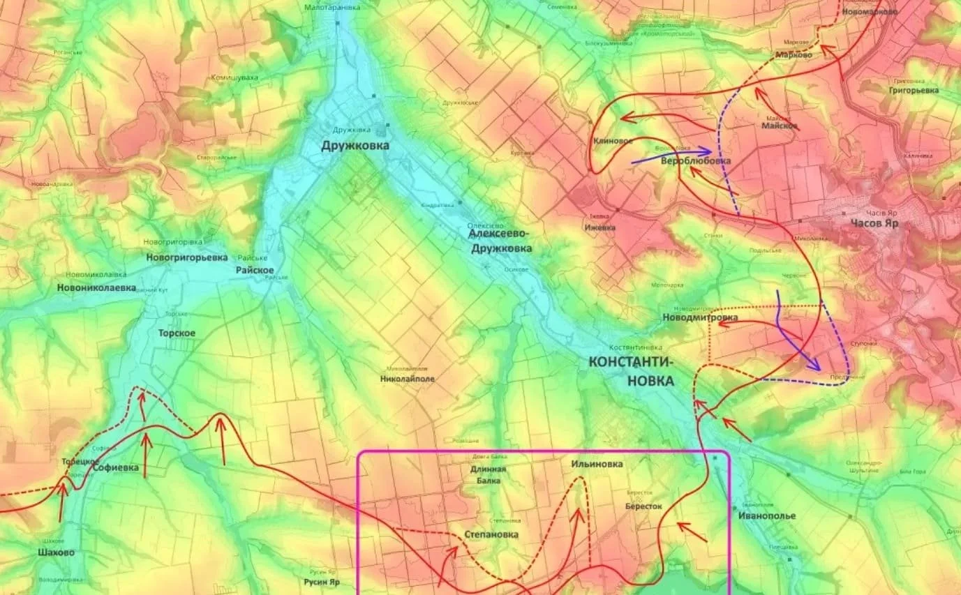 Кроме того, российские подразделения были вынуждены откатиться из Новодмитровки, где противник смог незначительно вклиниться в оборону. Вместе с тем успехи ВС РФ фиксируются южнее — в районах Степановки, Ильиновки и Берестка. Основная задача здесь — выход к южным окраинам Константиновки.