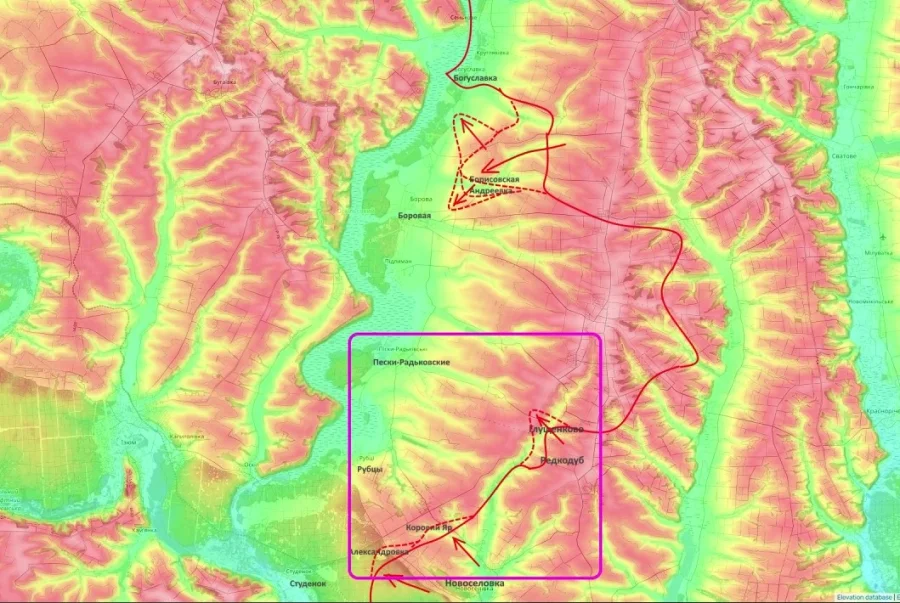 1. Севернее Купянска: попытки выбить врага из клина в районе Голубовки/Радьковки (уточняется), который позволяет ВСУ удерживать позиции на западном берегу Оскола.