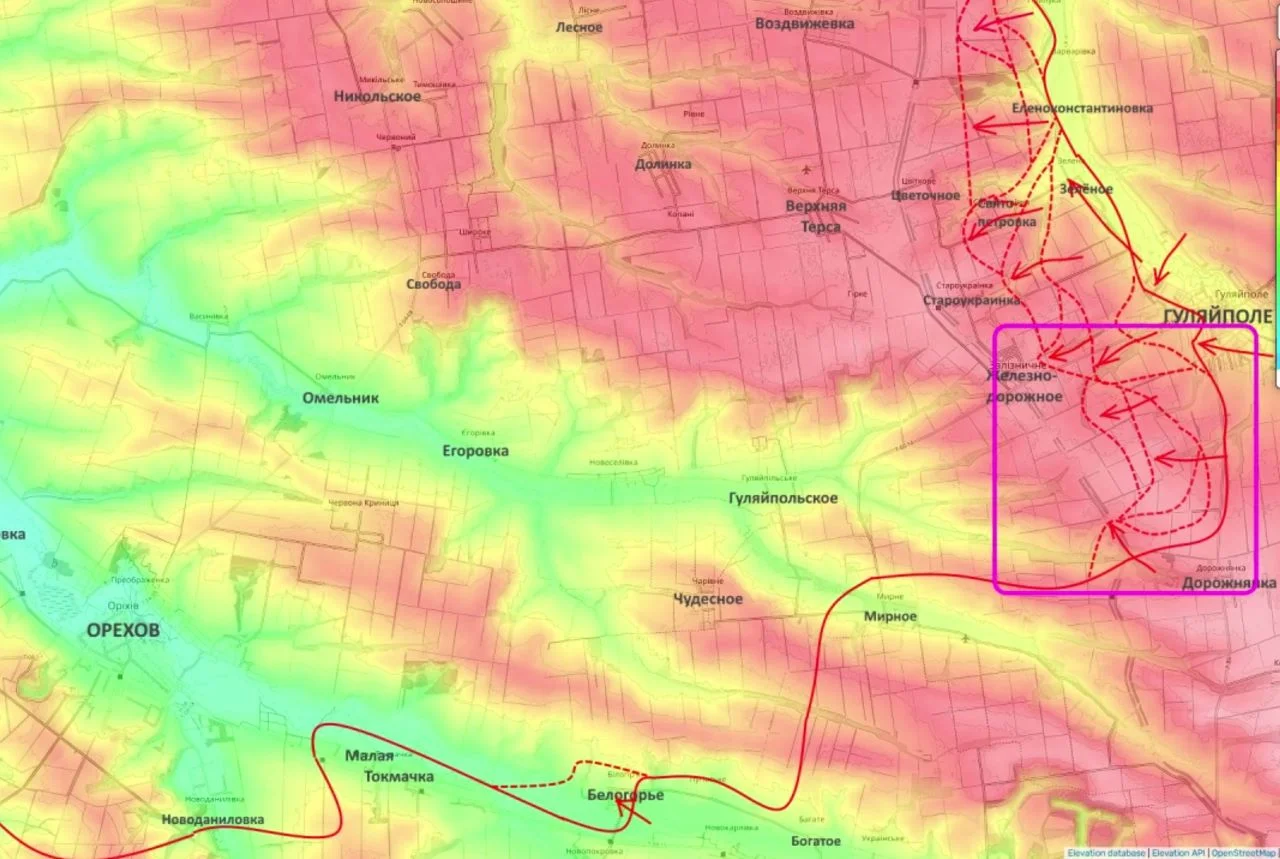 Особую активность проявляет группировка войск «Восток», действующая юго-западнее Гуляйполя. Здесь зафиксировано продвижение: занято несколько полей, наши штурмовики приблизились к населенному пункту Железнодорожное, пытаясь зайти в него с востока. Аналогичные тактические успехи достигнуты в районе Староукраинки и Цветочного.