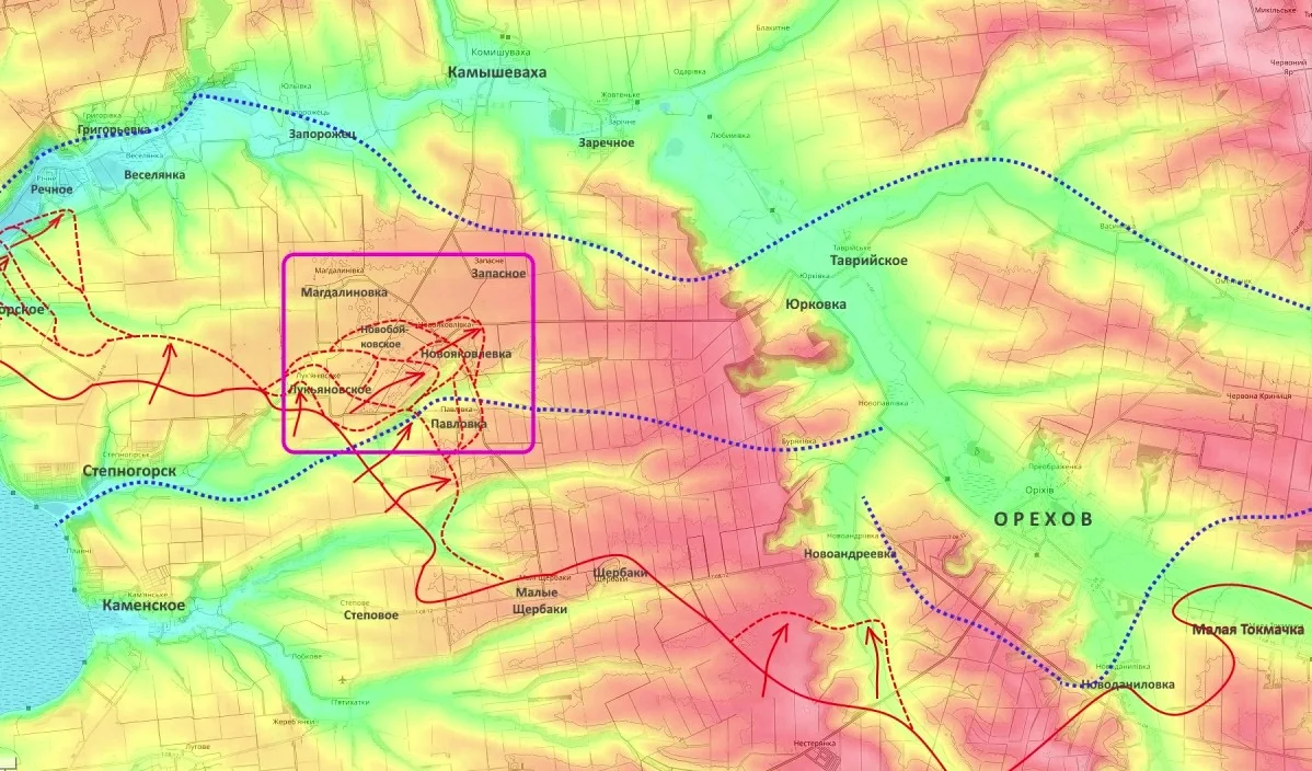 На Новопавловском участке наши бойцы выбили противника из лесополос западнее населенного пункта, сформировав устойчивый плацдарм для последующего удара на север, в направлении Федоровки. Гарнизон ВСУ в самой Новопавловке оказался в полуокружении и крайне уязвимом положении. Схожая динамика наблюдается и восточнее — в районе Муравки.