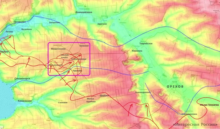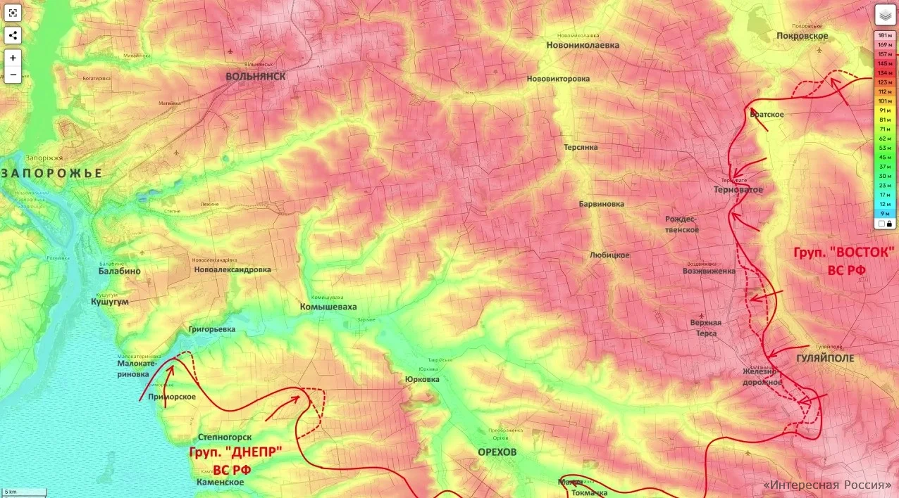 Одновременно российские штурмовые группы наращивают давление в районах Щербаков и Новоандреевки. Главная задача группировки «Днепр» — отрезать Ореховскую группировку ВСУ от линий снабжения и во взаимодействии с группировкой «Восток» взять её в клещи.
