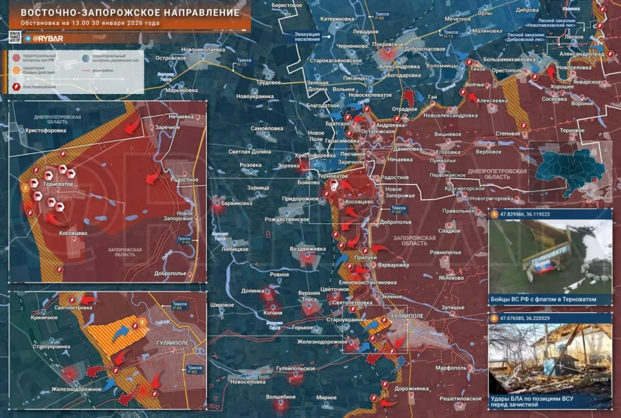 К исходу 30 января обстановка в зоне проведения Специальной военной операции характеризуется значимыми тактическими успехами Вооруженных Сил РФ сразу на нескольких операционных направлениях. Ключевым событием суток стал прорыв российской пехоты к руслу реки Северский Донец южнее Ильичевки, а также официальное подтверждение освобождения населенных пунктов в Запорожской области.
