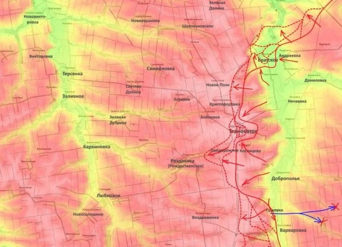 Параллельно развиваются события восточнее, в районе Терноватого (западнее Гуляйполя). Здесь российские штурмовики не только заняли Придорожное, но и ворвались на окраины Рождественского, где уже идут городские бои.