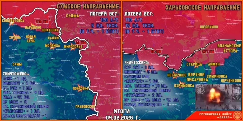 Интересная Россия продолжает следить за развитием обстановки в зоне проведения специальной военной операции. К утру 5 февраля линия боевого соприкосновения остаётся активной практически по всей дуге фронта — от Сумской и Харьковской областей до Запорожья и Донбасса.