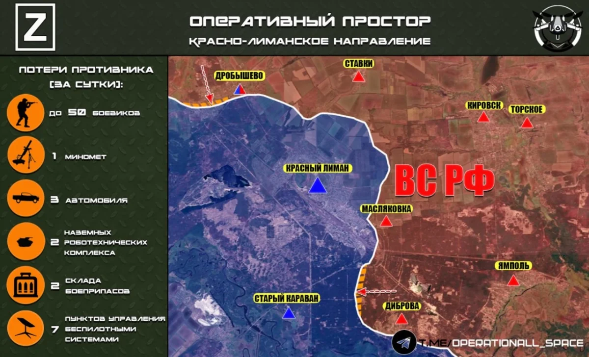 1. Краснолиманское направление: ВС РФ наступают севернее и западнее Красного Лимана, а также на юг от Ставков. Выход к рубежу Александровка — Коровий Яр создает прямую угрозу последнему сухопутному коридору снабжения Боровской группировки ВСУ.