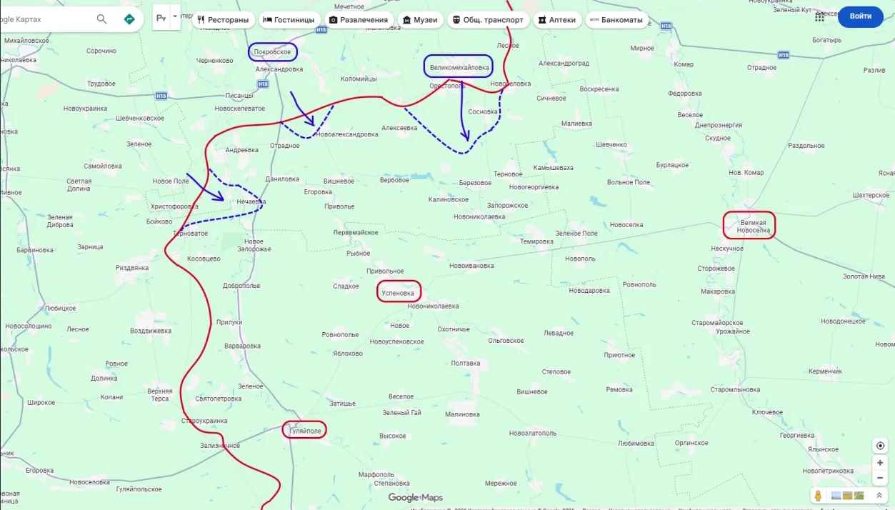 Опираясь на логистические узлы в Покровском и Великомихайловке, ВСУ пытаются ударить в тыл группировки «Восток». На данный момент наибольшего продвижения враг добился в районе Новомихайловки, где ему удалось отбросить наши передовые заслоны у Аристополя и Сосновки.