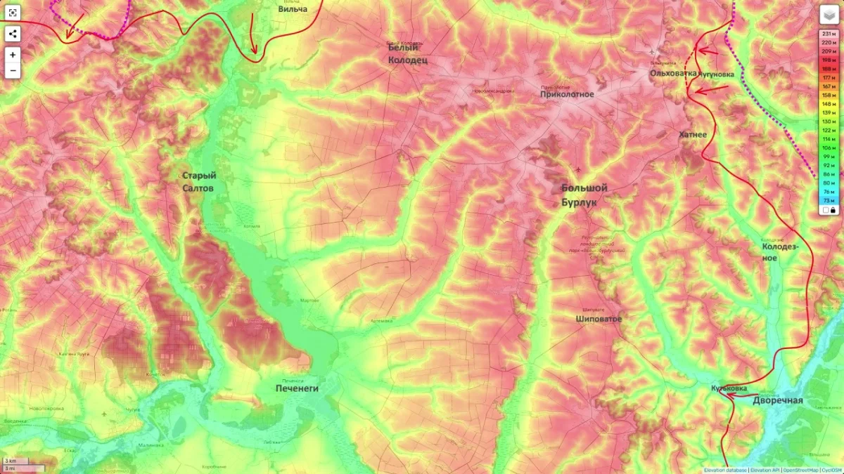 - Волчанский участок: Группировка «Север» продолжает атаку на Ольховатку, освобождена Чугуновка. Мы вышли на восточную окраину Ольховатки и, судя по вектору атак из Вильчи вдоль восточного берега Северского Донца, пытаемся взять в клещи группировку ВСУ в районе Белого Колодезя.