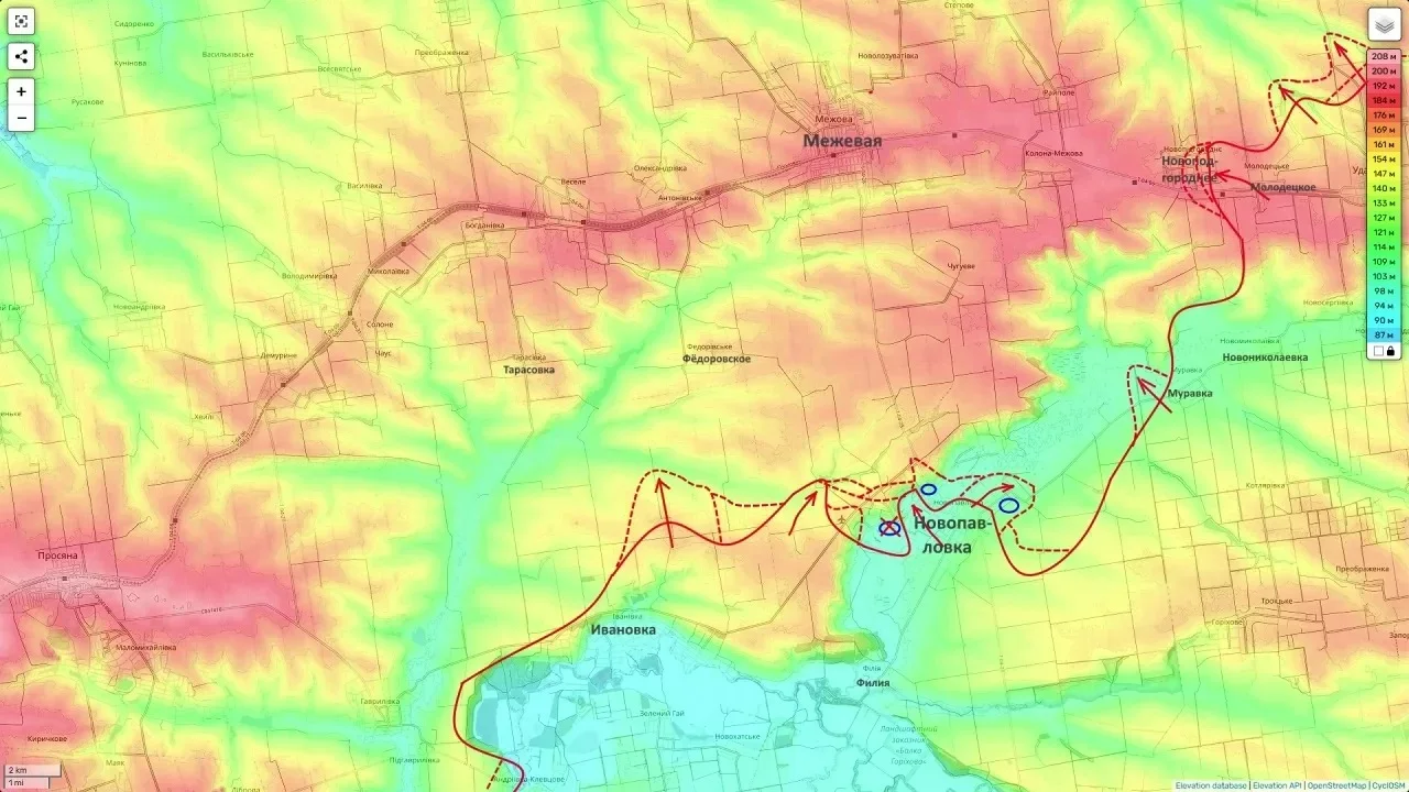 Однако главный тактический успех зафиксирован южнее Закотного. Здесь подразделения ВС РФ совершили ощутимый рывок, взяв под контроль высоты, что позволило начать непосредственный штурм Кривой Луки и Калеников.