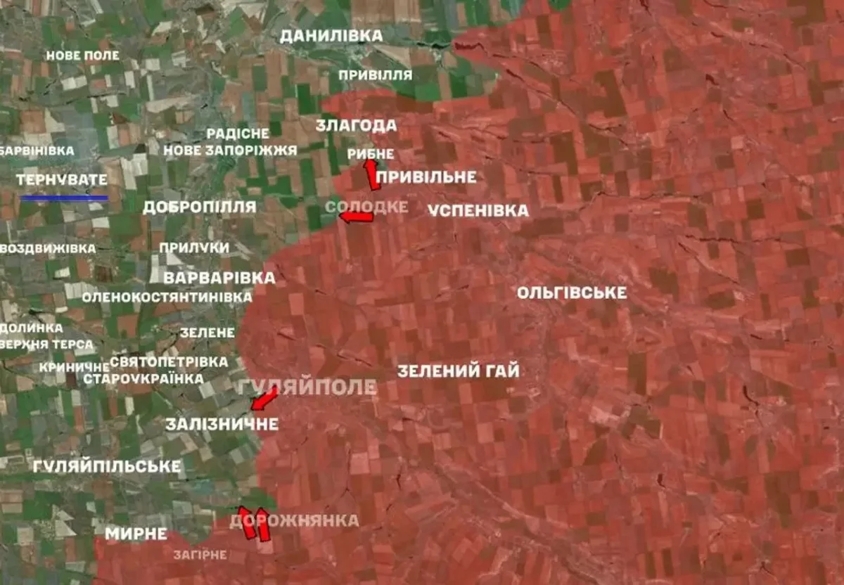 На карте село Терноватое отмечено как подконтрольное ВСУ. Более того, «украинскими» нарисованы еще 5 км территорий к востоку от него. Однако в той же сводке сообщается об атаках ВС РФ «в районе Гуляйполя и Зализничного».