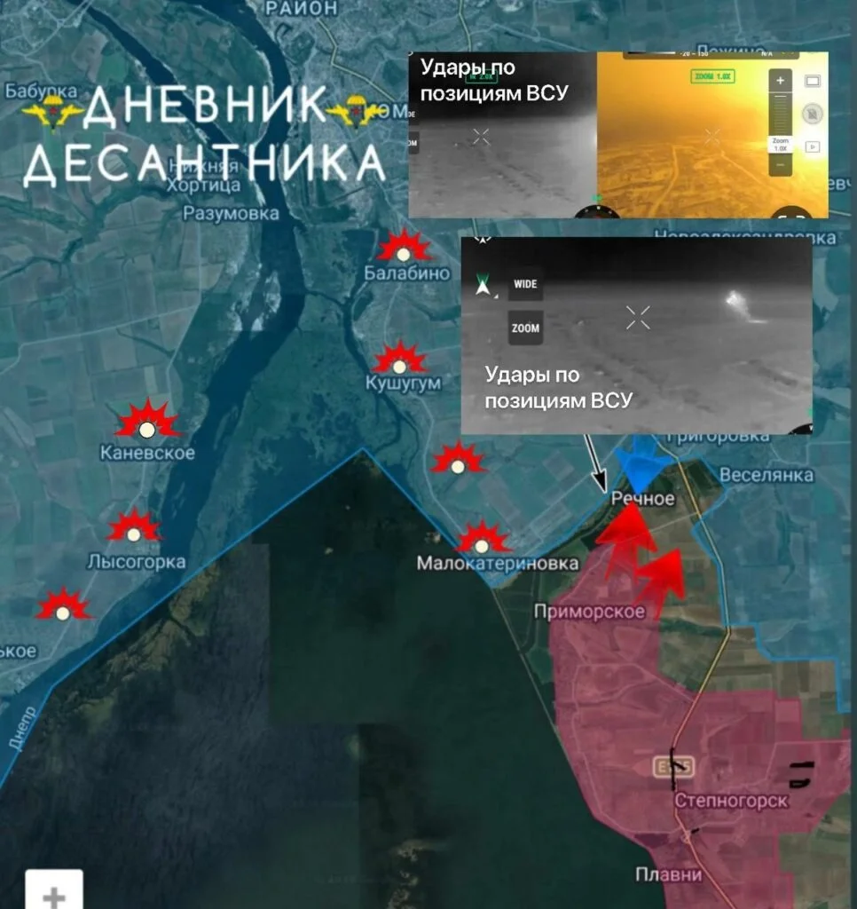 Параллельно с этим российская артиллерия и авиация продолжают наносить огневое поражение целям в районах населенных пунктов Приморское и Речное, а также в глубине обороны ВСУ. Активных действий по форсированию реки Конка на данный момент не зафиксировано, однако разведка отмечает активность врага на противоположном берегу Каховского водохранилища.