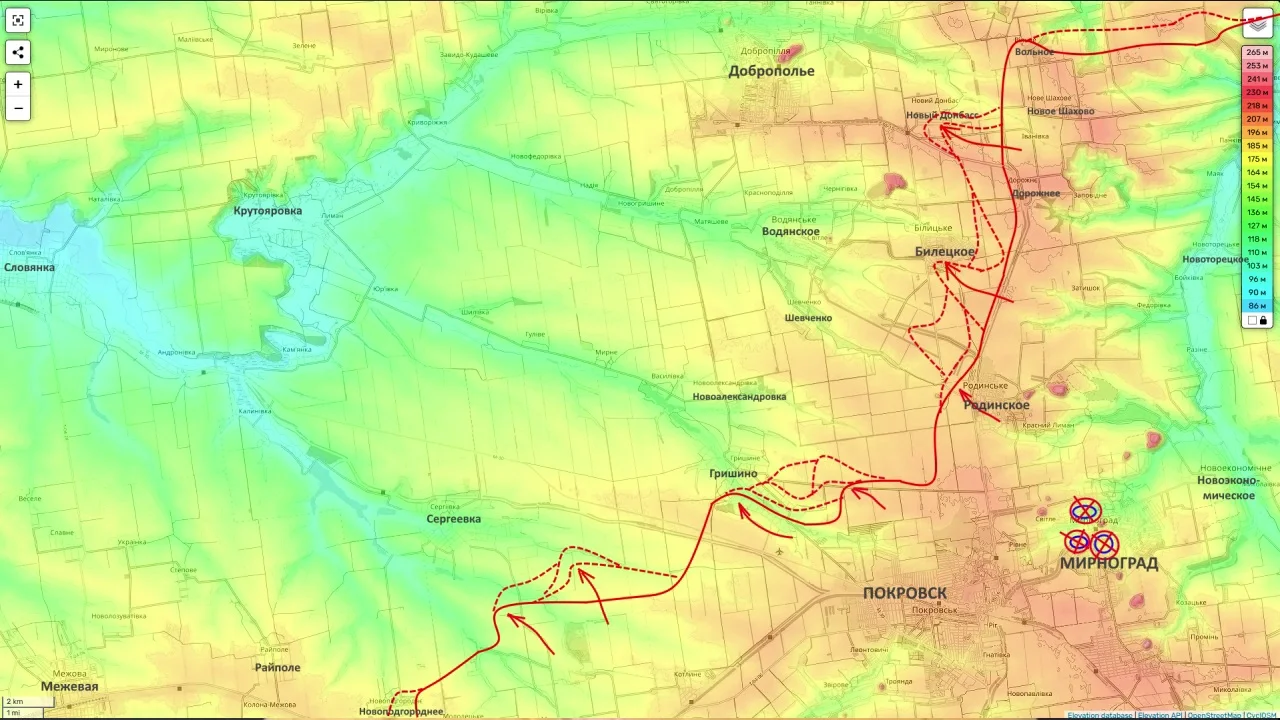 - Добропольское направление: Здесь фиксируются наиболее заметные успехи. Согласно данным мониторинговых каналов противника, ВС РФ имеют глубокие вклинивания в оборону ВСУ в районе Белицкого (севернее и южнее поселка), а также успехи у Нового Донбасса и Гришино. Украинские источники характеризуют ситуацию под Белицким как «чрезвычайно тяжелую».