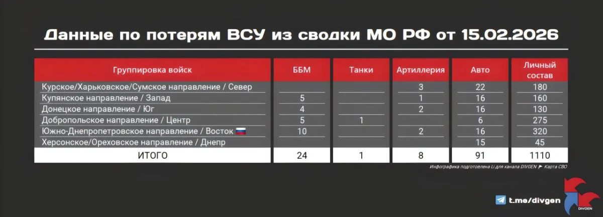 Потери противника за минувшие сутки (по данным МО РФ на 15.02.2026):