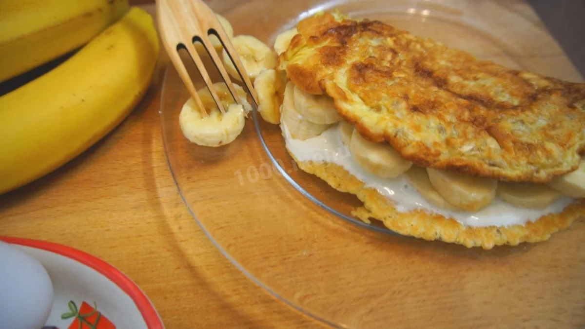 - Ингредиенты: 4 ст. л. овсяных хлопьев, 80 мл молока, 1 яйцо, 1 банан, мед, растительное масло.