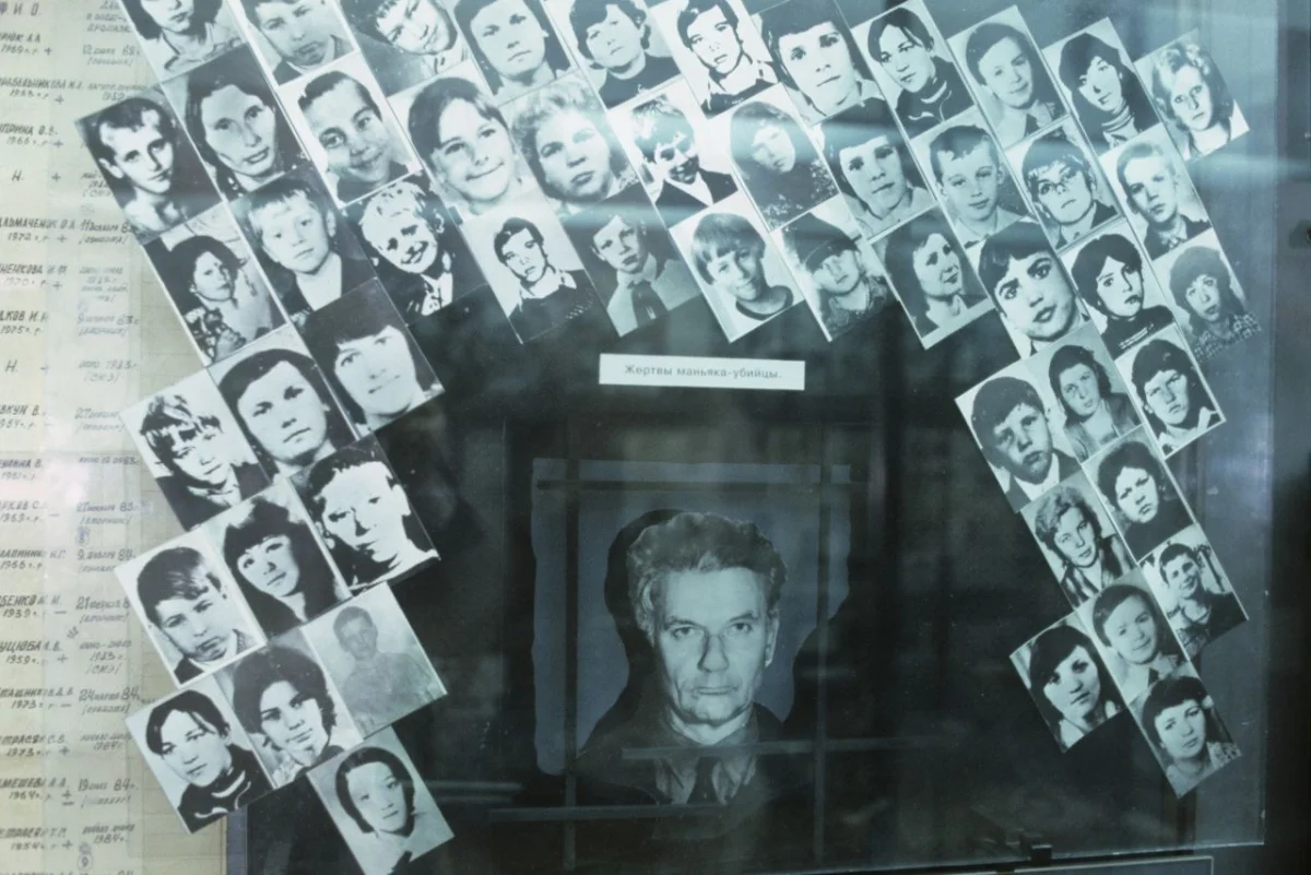 Центральный музей МВД РФ. Серийный убийца, маньяк Андрей Чикатило, убивший с особой жестокостью 53 человека. Рядом с его фотографией размещены фотоснимки его жертв. Фото: РИА Новости