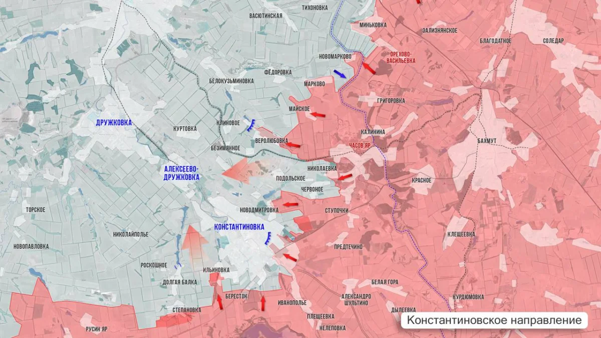 - Константиновское направление: Министерство обороны РФ официально сообщило об освобождении села Миньковка, расположенного к северу от Часов Яра. Это существенно улучшает наши позиции для охвата города. Российские штурмовики продвигаются в районе Берестовой и уже ведут бои в южной части самой Константиновки, а также в микрорайоне Украинский хутор на северо-востоке.